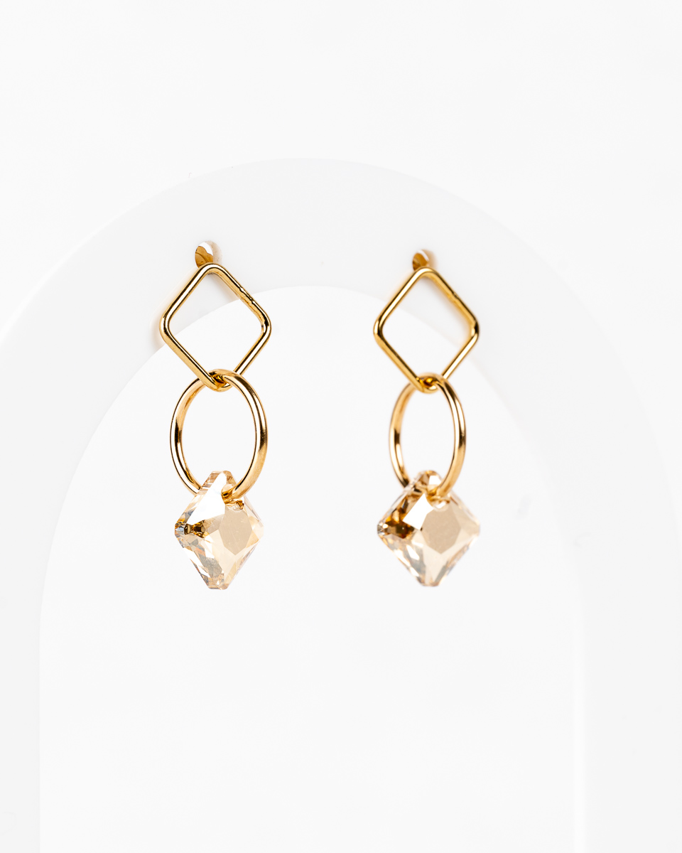 Présentation – Boucles d’oreilles géométriques, or laminé et cristal