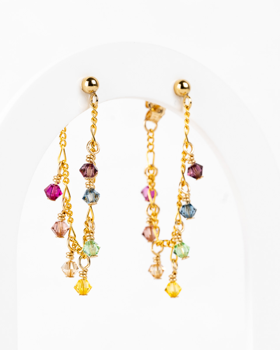 Les boucles d’oreilles Mylo sont des boucles d’oreilles « devant derrière », c’est à dire que la chaîne part de l’avant et est reliée au fermoir à l’arrière de l’oreille. Ornées de petits cristaux multicolores aux teintes douces, les boucles d’oreilles Mylo apportent une touche de couleur à votre tenue, tout en légèreté.