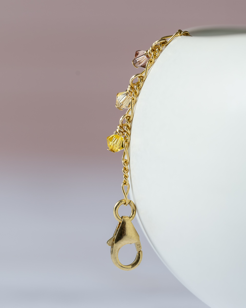 Le bracelet Mylo est en or laminé 14 carats (585/1000ème), un matériau avec lequel j’ai choisi de travailler car il est hypoallergénique et parce que son plaquage est résistant.