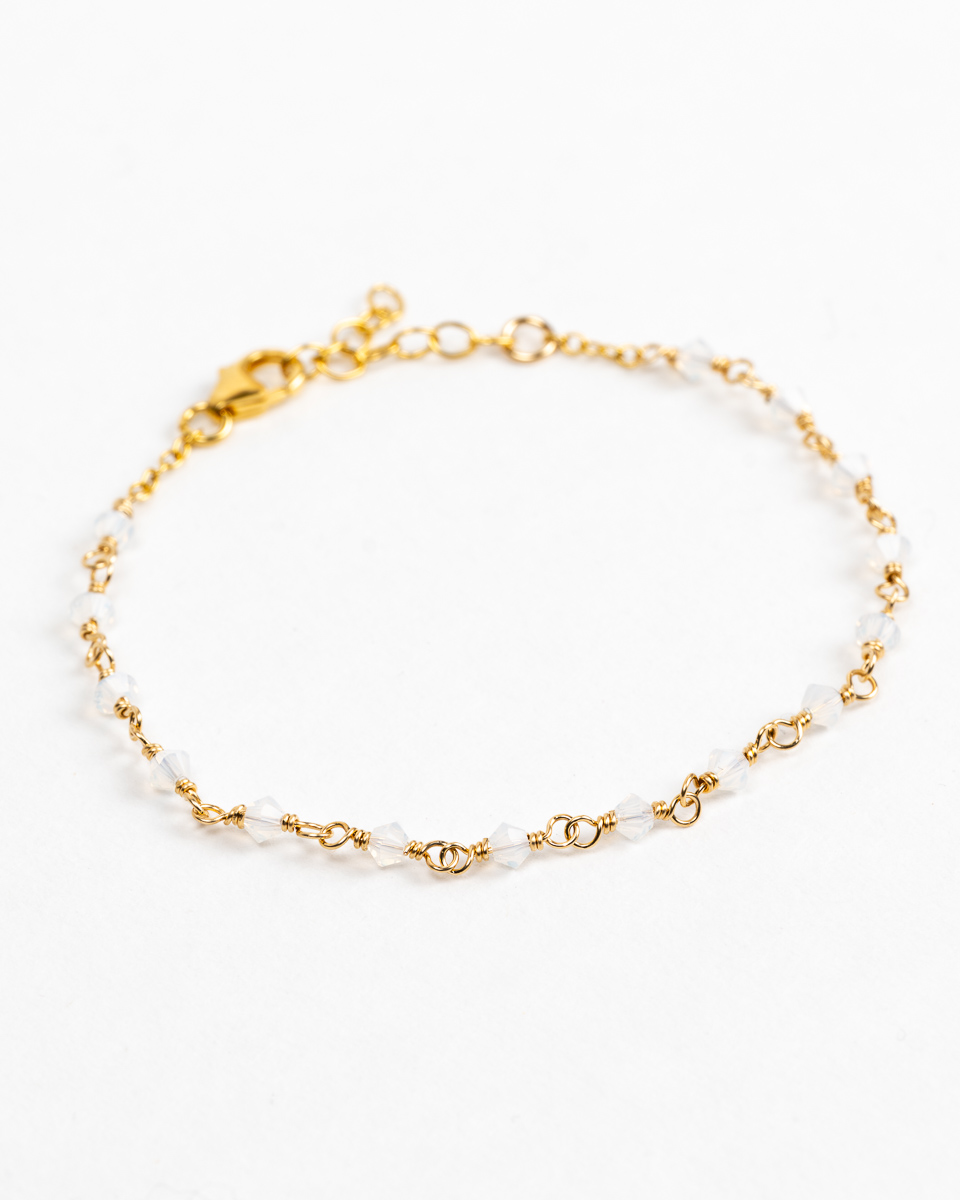 Bracelet Prisma, bracelet fin en or laminé et perles de cristal blanc opalescent.