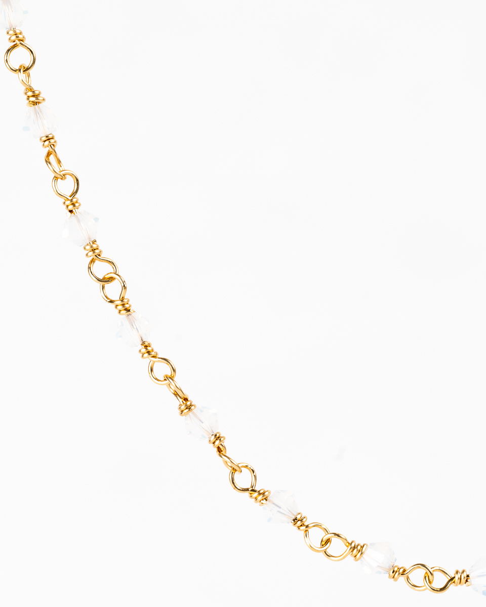 Ce bracelet fin fait partie de la collection Prisma. Il est en or laminé et est orné de perles de cristal couleur « blanc opalescent ».