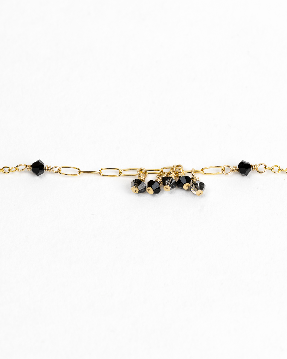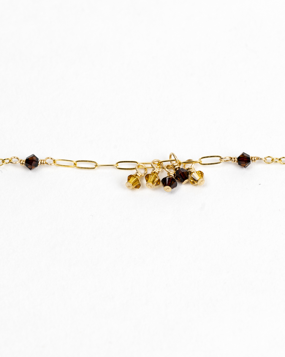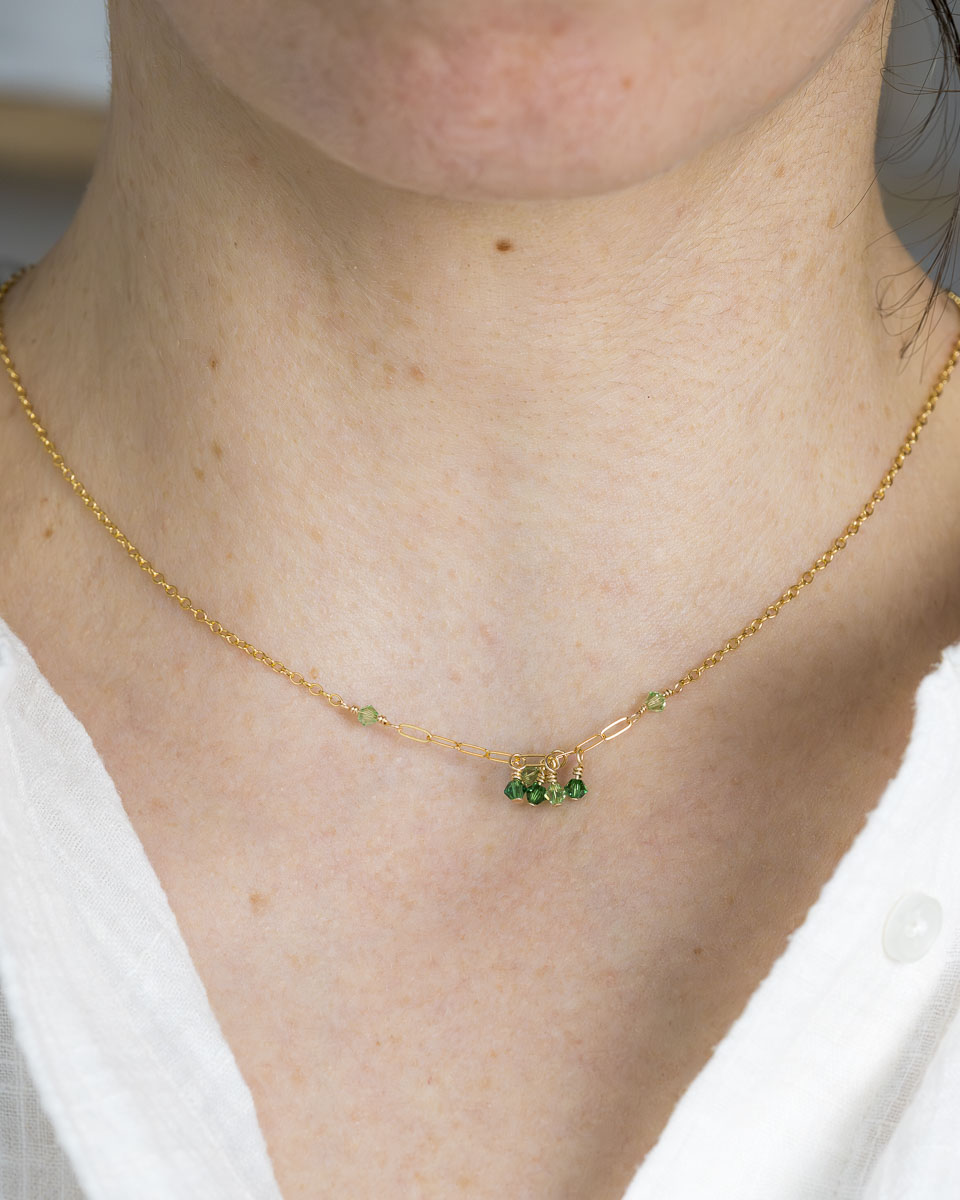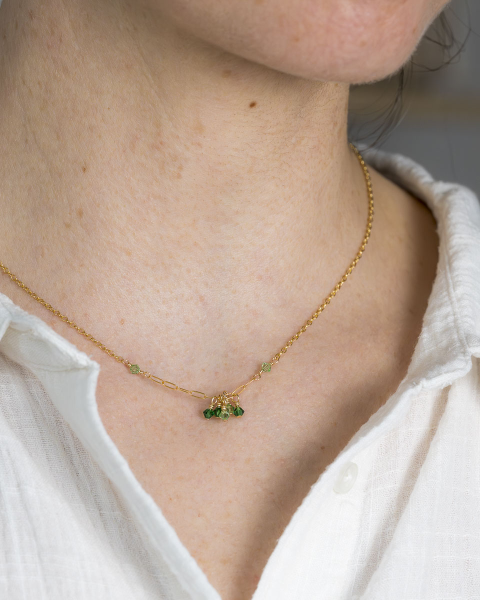 Le collier Dana est en or laminé 14 carats, respectueux de votre peau, et perles de cristal d’Autriche, délicates et scintillantes.