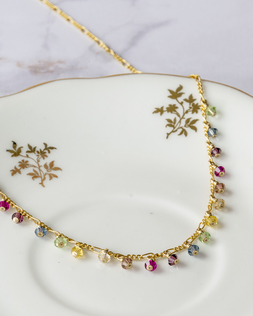 Le collier Mylo est en or laminé 14 carats (ou « Gold filled 14k ») et est hypoallergénique et résistant. Les perles multicolores sont en cristal de fabrication européenne.