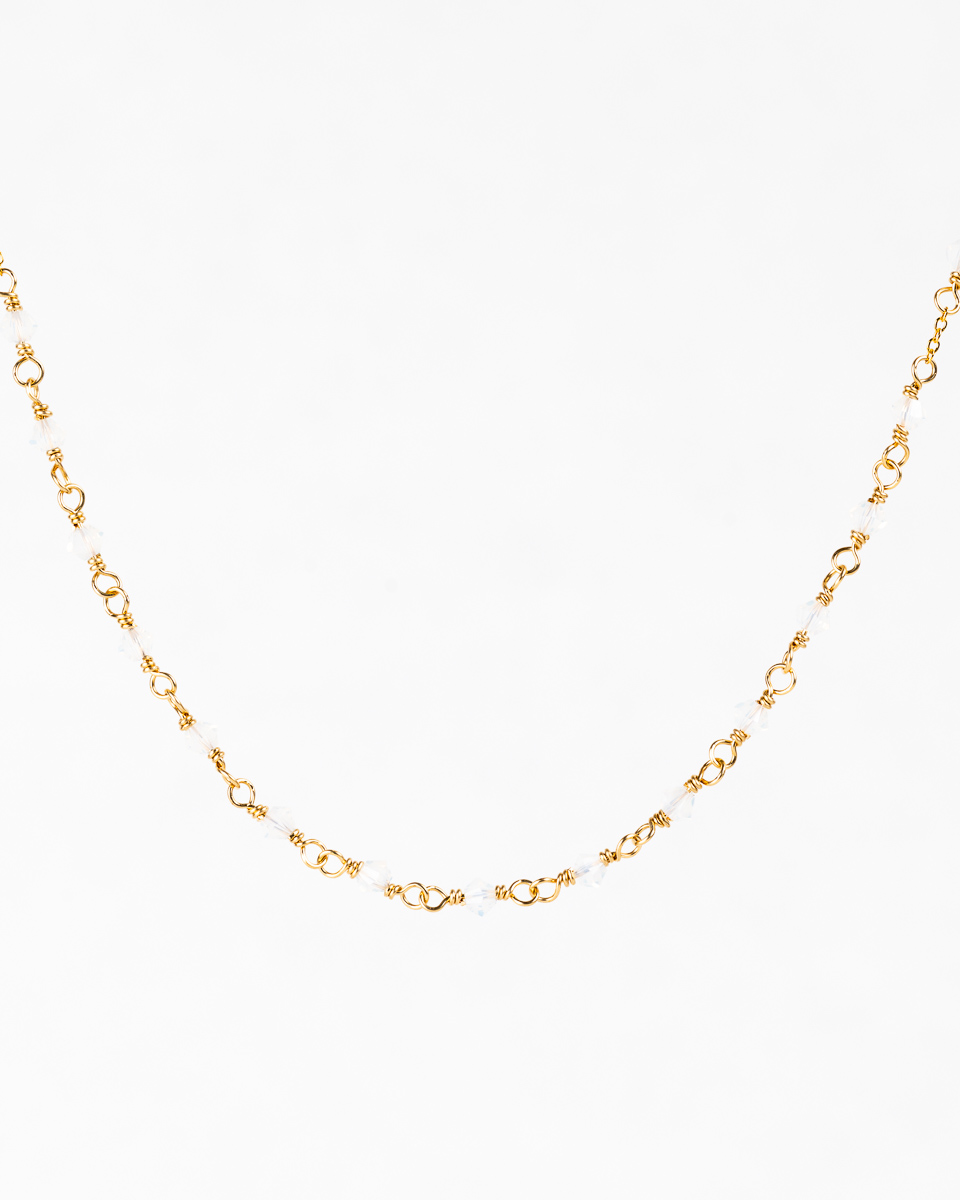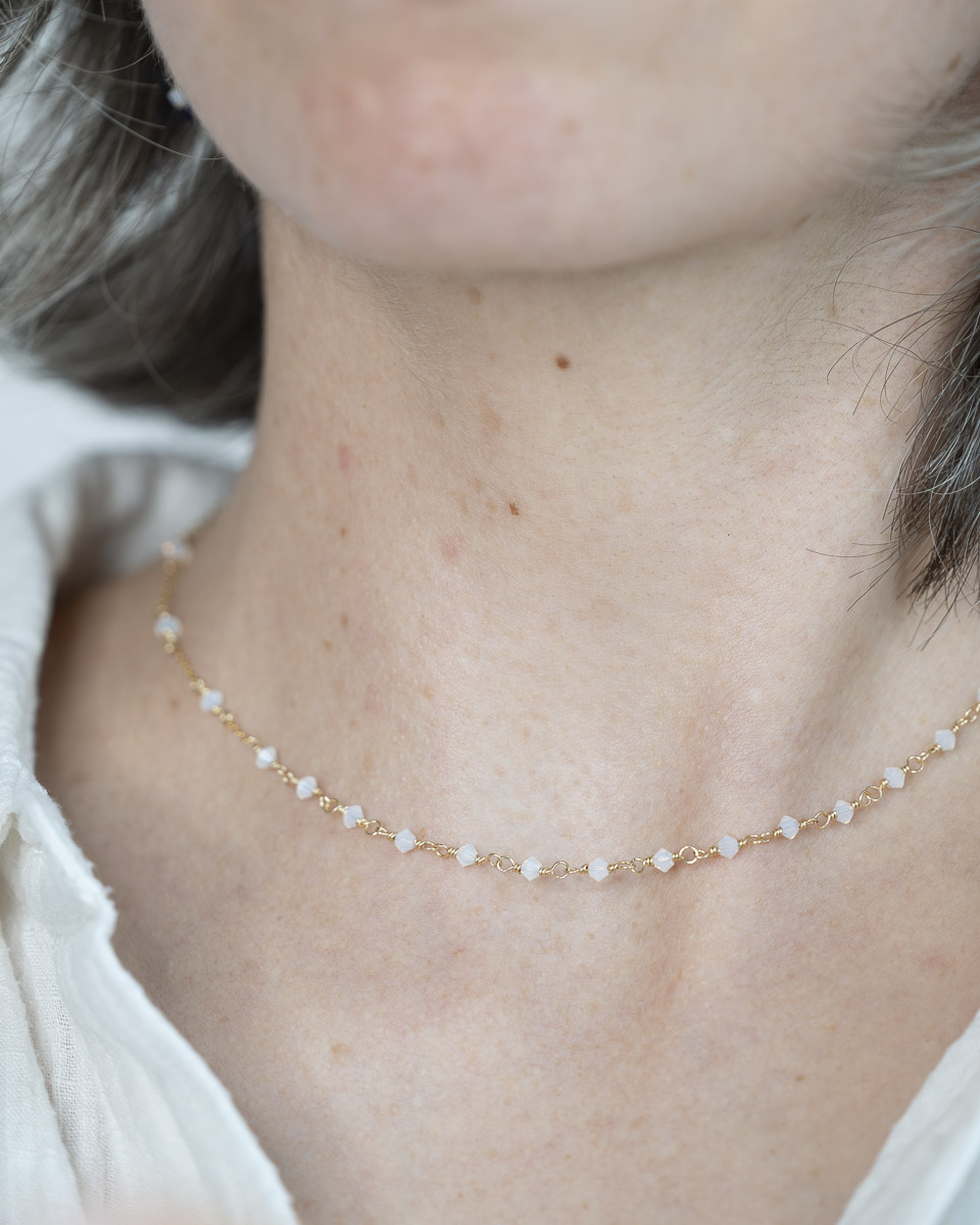 Collier Prisma, collier fin en or laminé et perles de cristal blanc opalescent.