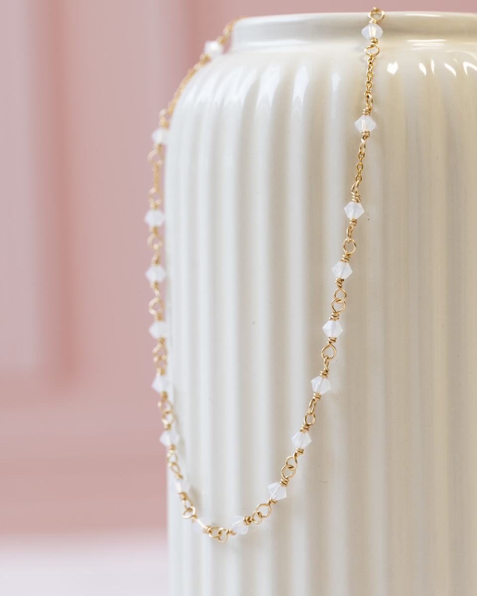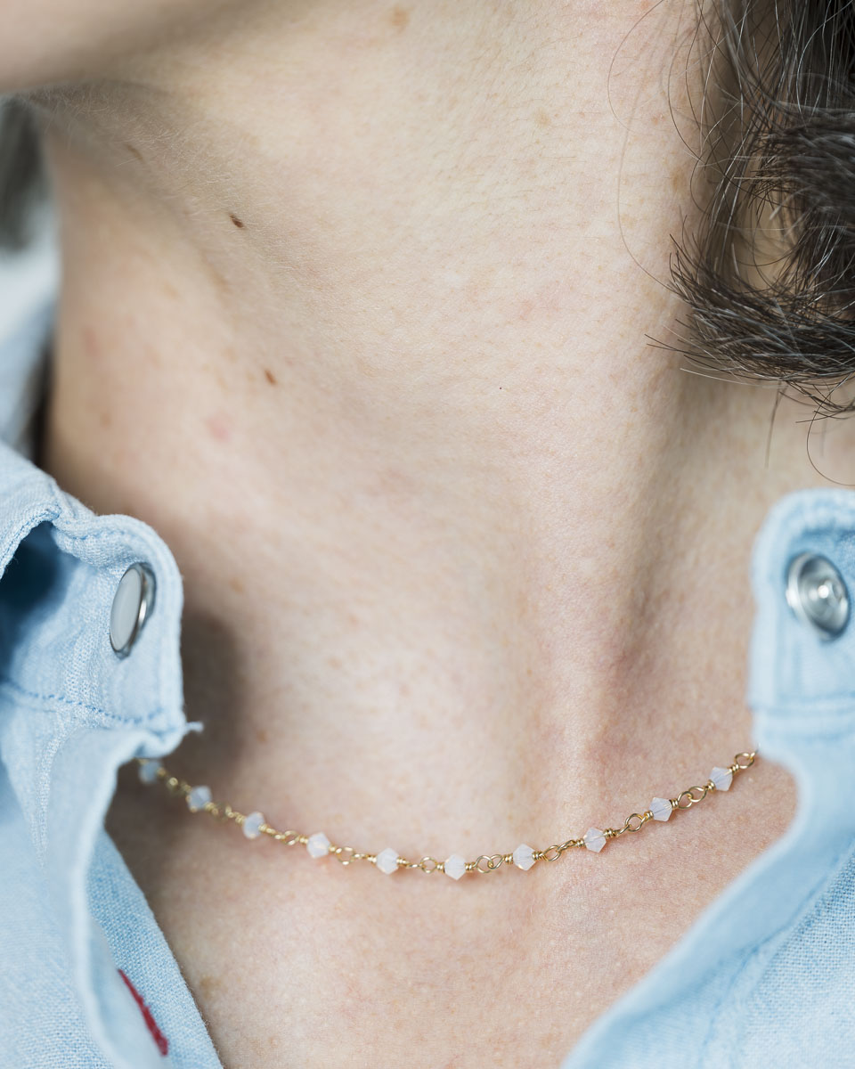 Ce collier court fait partie de la collection Prisma. Il est en or laminé 14 carats et est orné de perles de cristal couleur blanc opalescent.